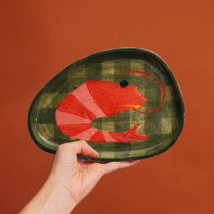 Each plate is handbuilt and hand-painted from stoneware, making every shrimp and every pebble form truly one-of-a-kind. Natural speckles, and organic variations are part of its handmade character and beauty.